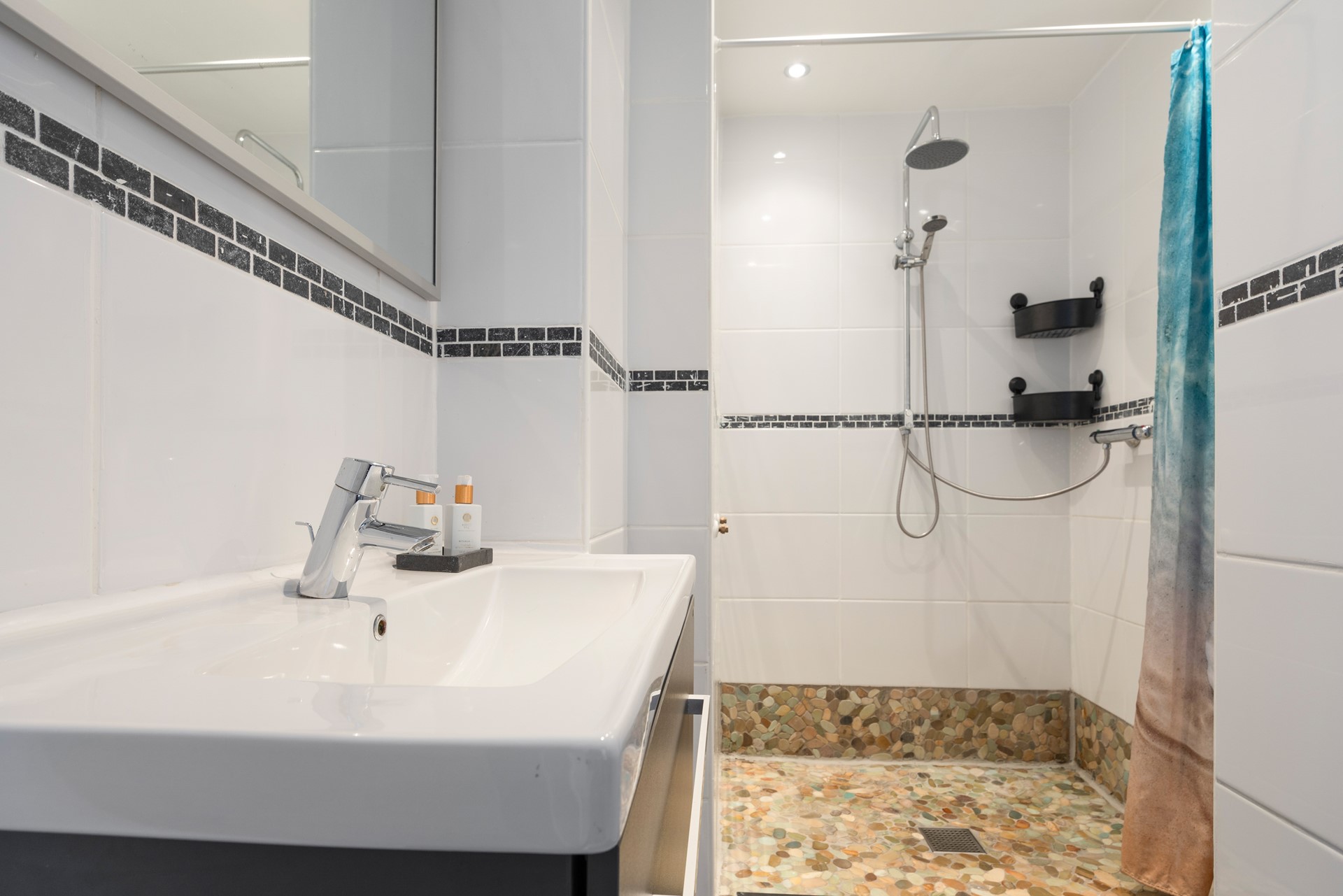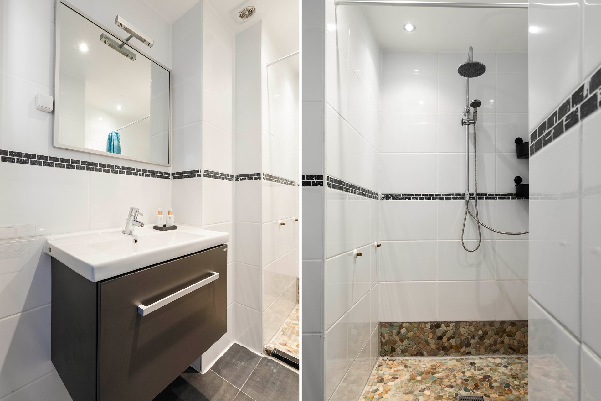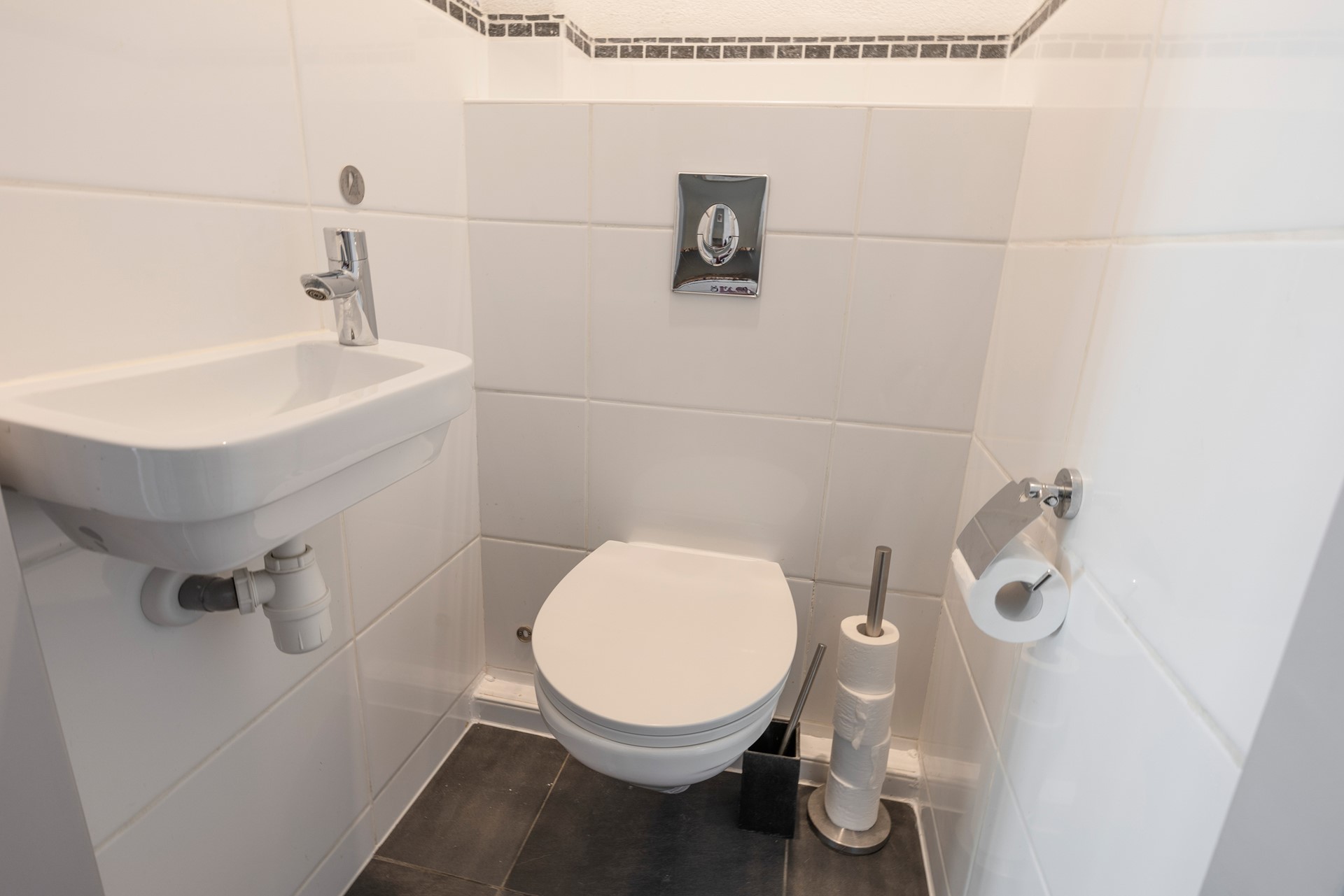 De badkamer en toilet zijn in dezelfde stijl afgewerkt waarbij het toilet is voorzien van een zwevend toilet en fonteintje. De badkamer is voorzien van een wastafelmeubel. een douche en een decentrale ventilatie. De toiletruimte is half hoog betegeld en de badkamer is volledig betegeld.