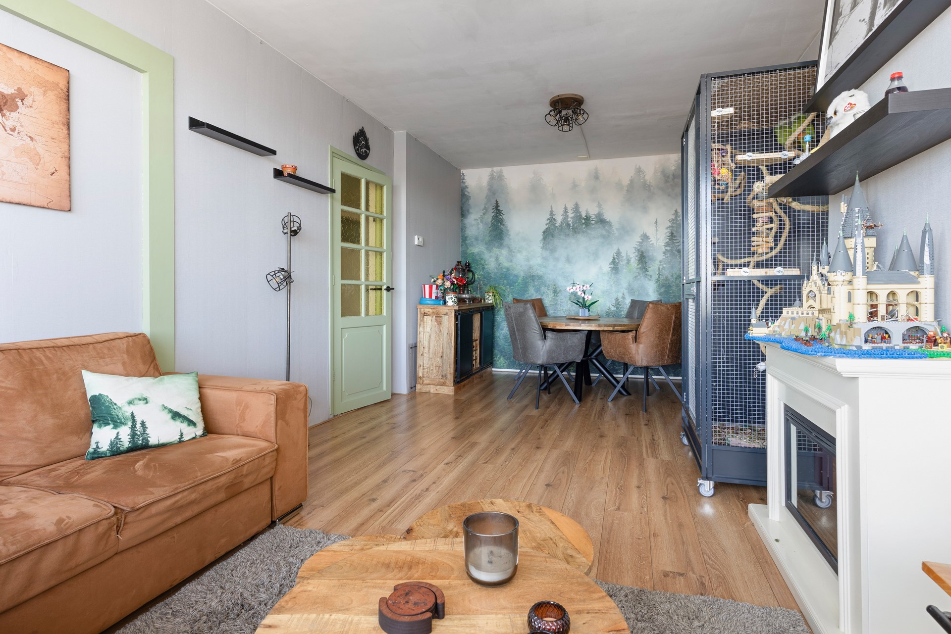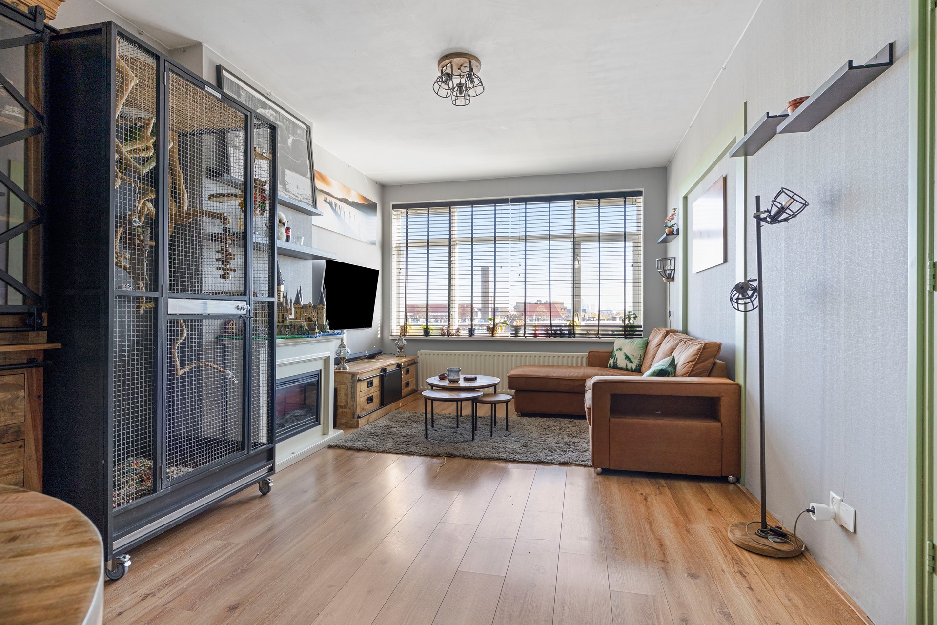 De woonkamer is te bereiken via de overloop en biedt tevens een fraai uitzicht over Den Haag.
